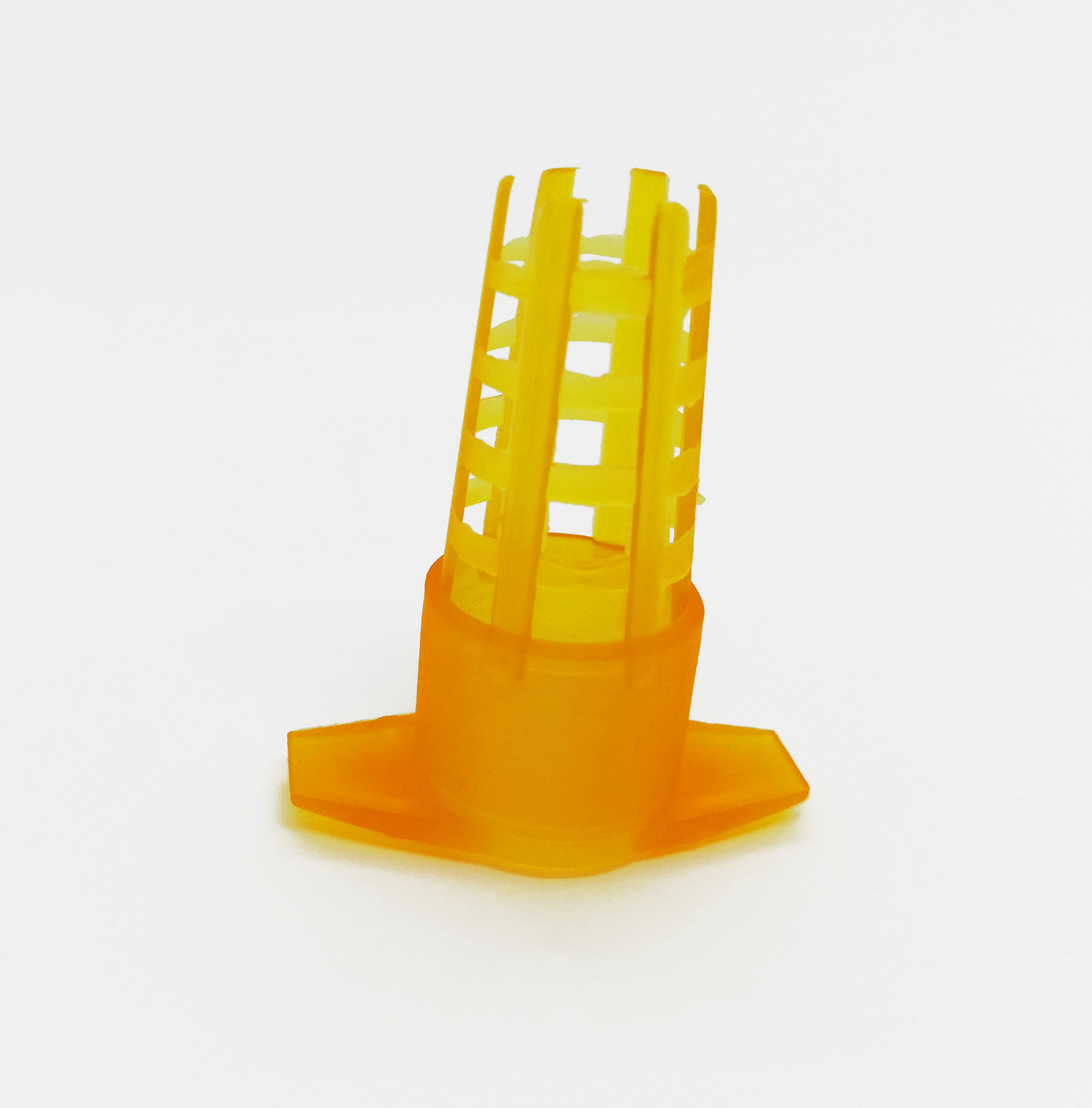 Peça plástica amarela cilíndrica com aberturas e base larga