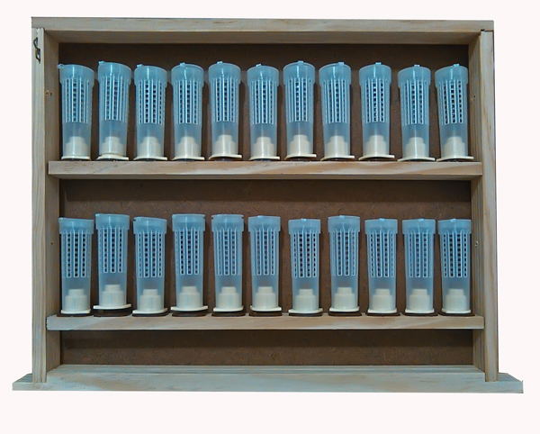 Caixa de madeira com tubos plásticos translúcidos e tampas azuis