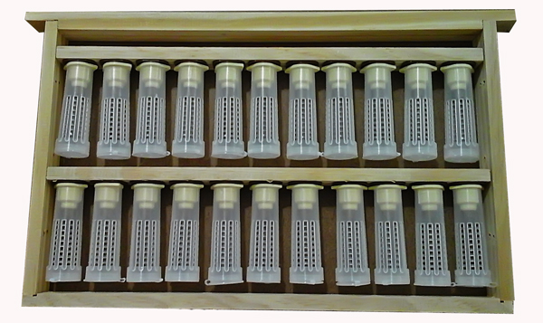 caixa de madeira com 20 tubos de ensaio de plástico transparentes com tampa branca e etiquetas numeradas