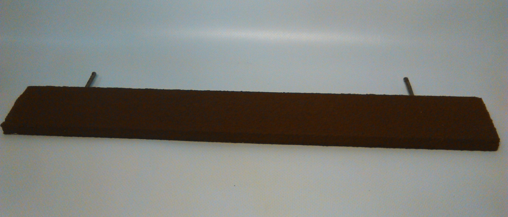 Régua de madeira castanho escuro com dois pregos em fundo branco