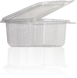 Recipiente plástico transparente com tampa articulada e textura canelada