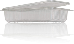 Embalagem plástica transparente retangular com tampa articulada ligeiramente aberta.