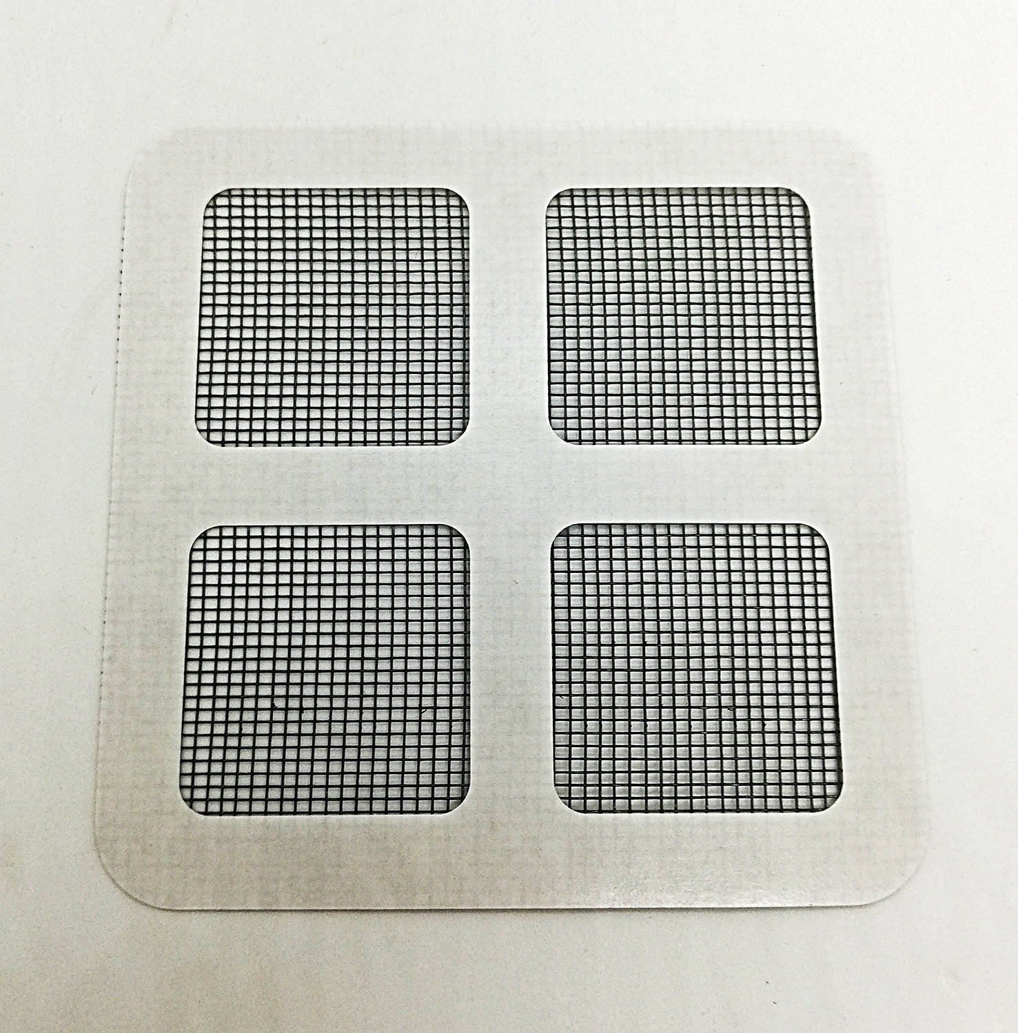 Peça de metal quadrada com quatro janelas de malha preta