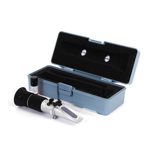 Instrumento de vidro e metal com frasco e estojo azul claro aberto