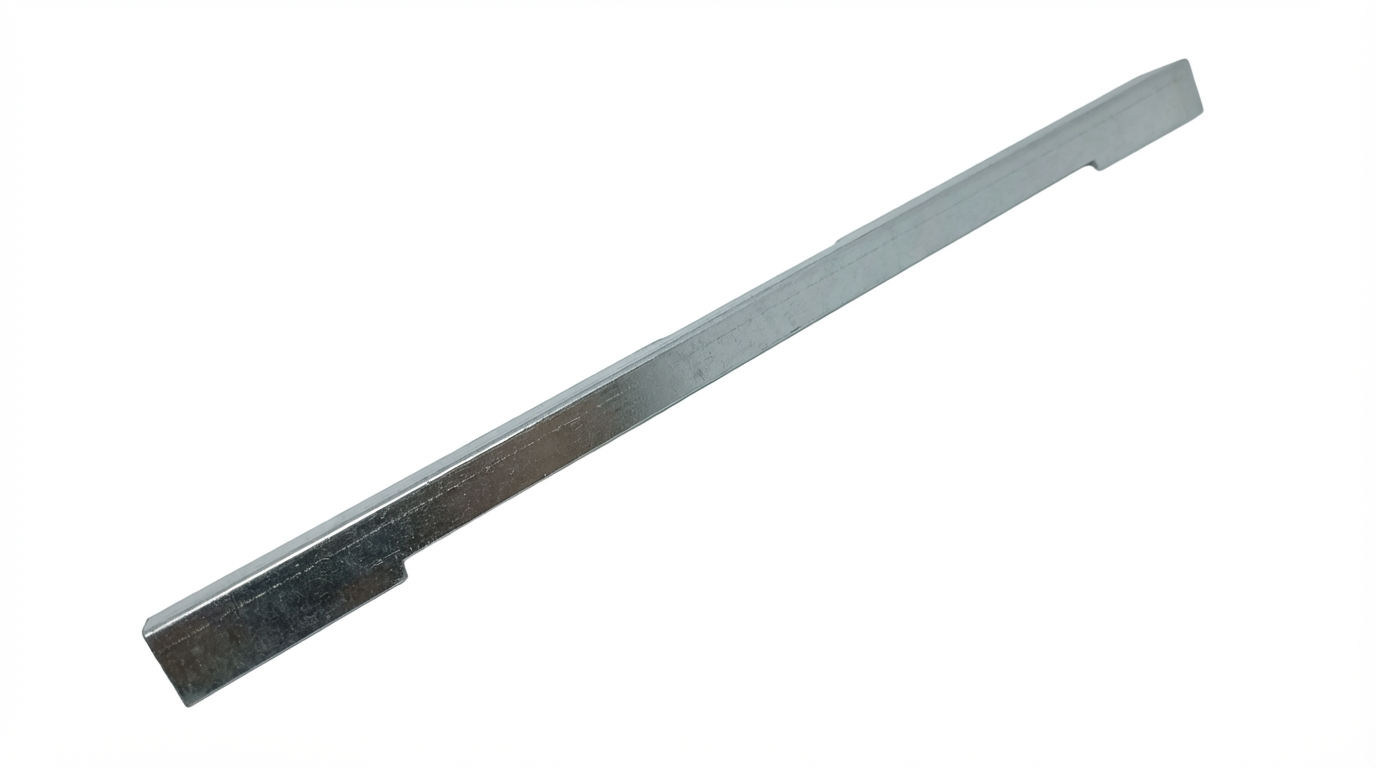 Barra metálica prateada longa com textura brilhante sobre fundo branco