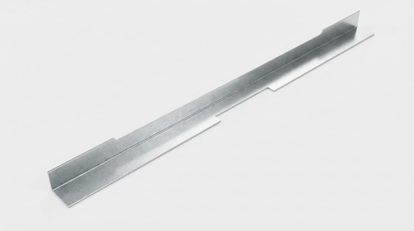 Perfil metálico em aço galvanizado com dobras em ângulo sobre fundo branco