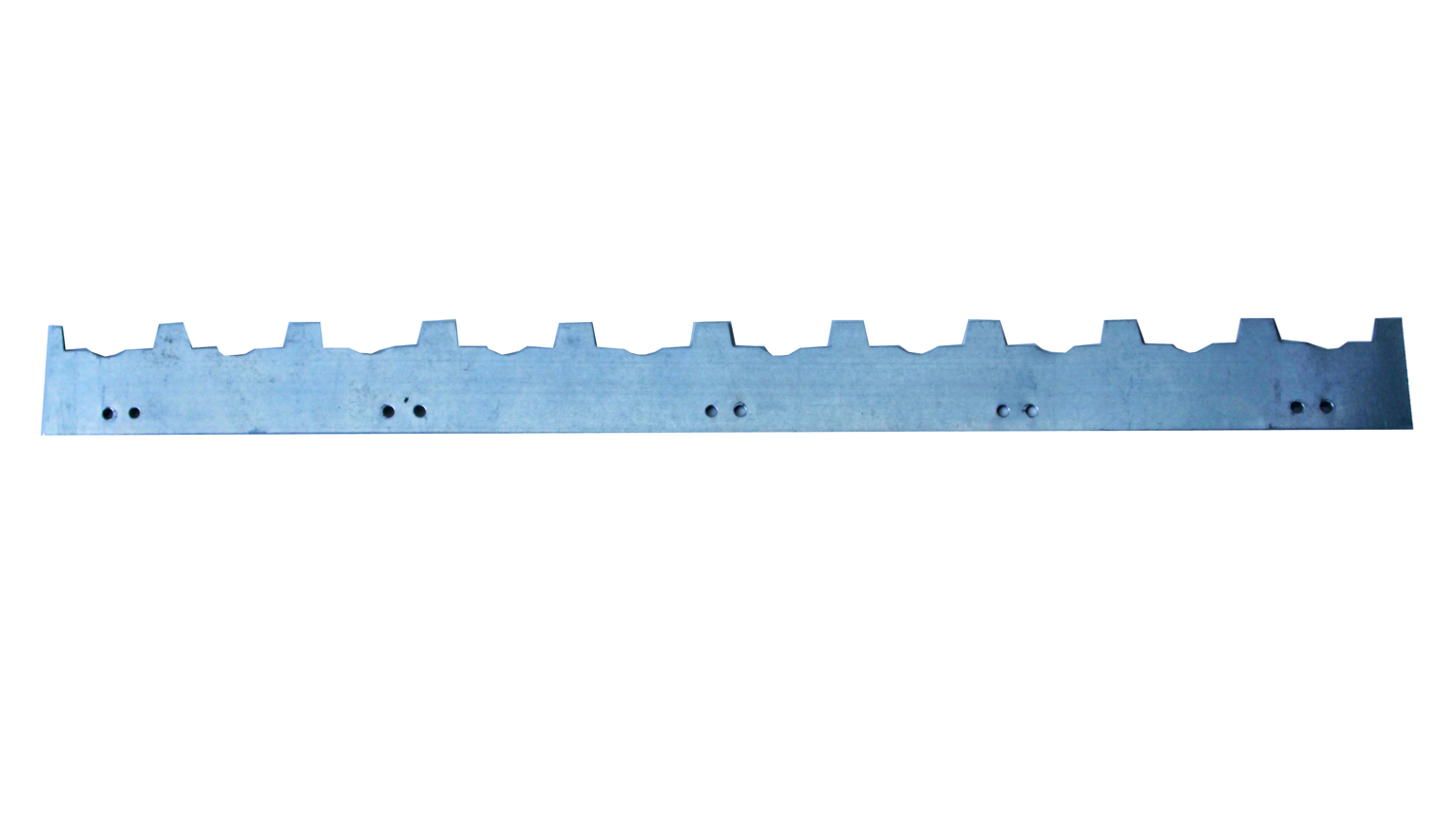 Peça metálica longa com recortes e orifícios num fundo branco