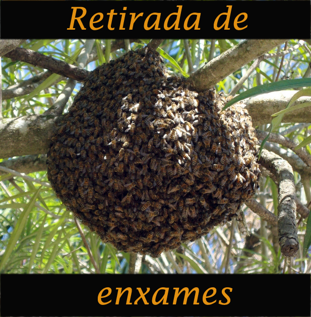 Enxame de abelhas num ramo de árvore com texto 'Retirada de enxames'