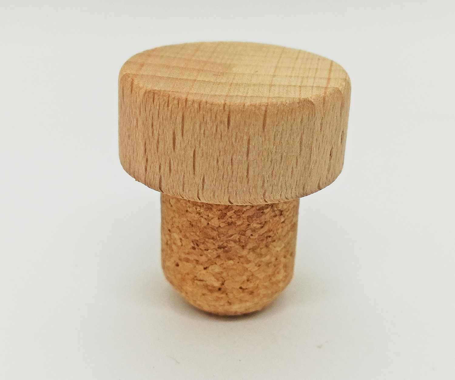 Rolha com parte superior em madeira clara e base de cortiça castanha