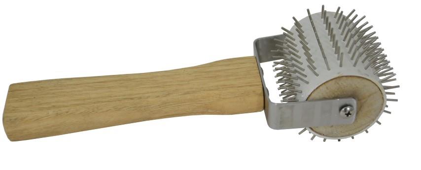 Rolo de madeira e metal com agulhas finas