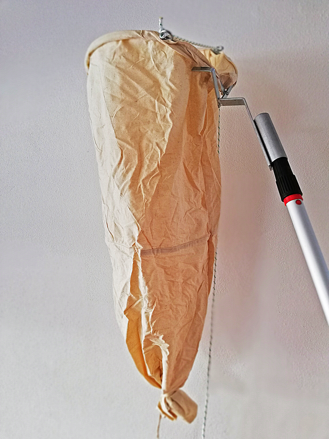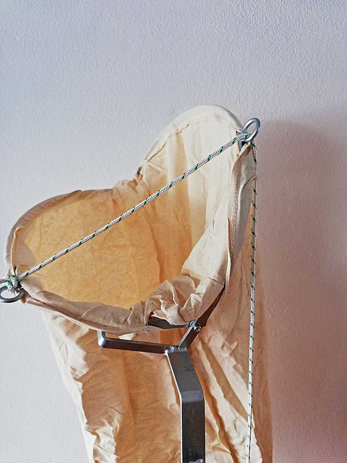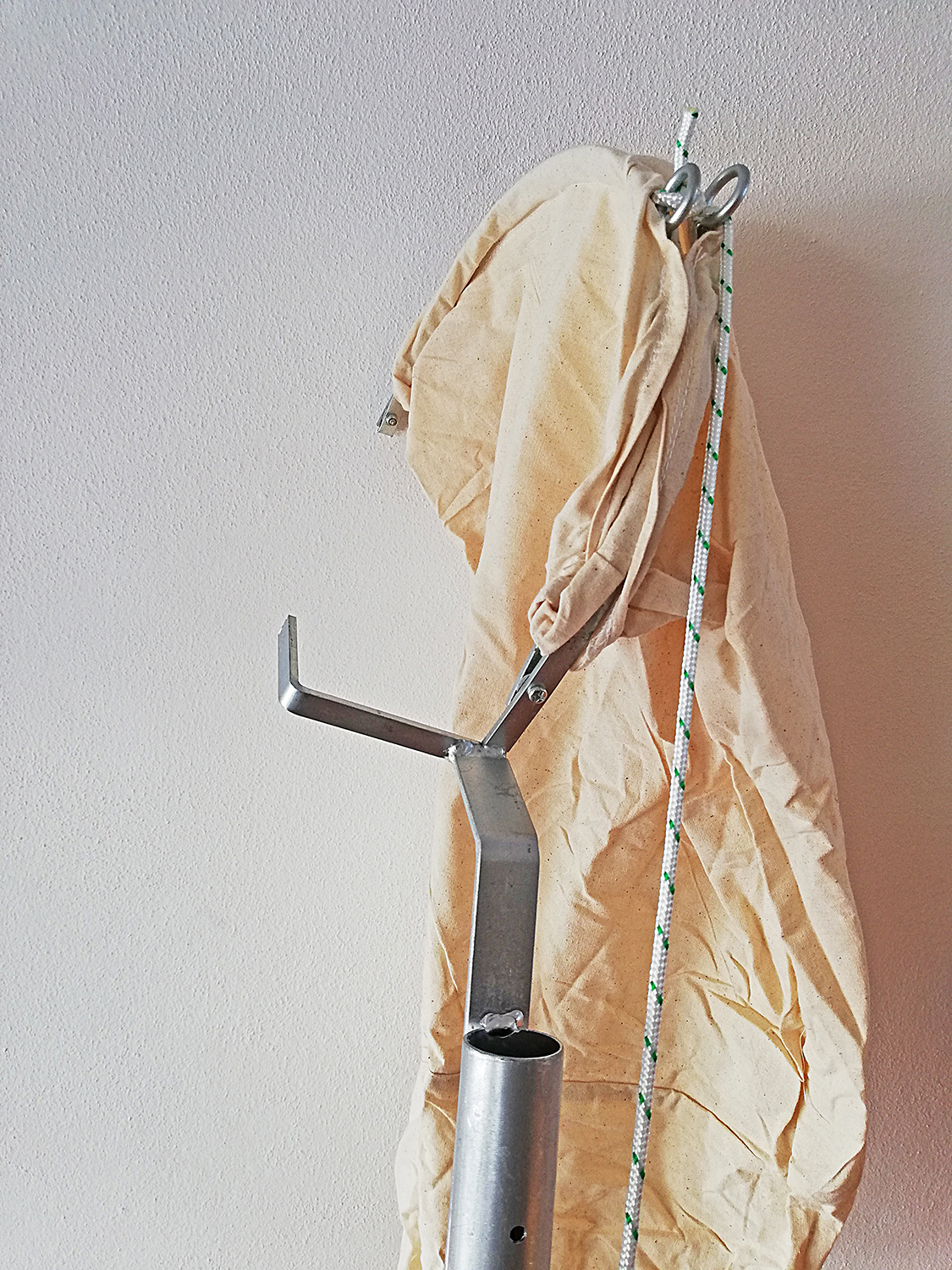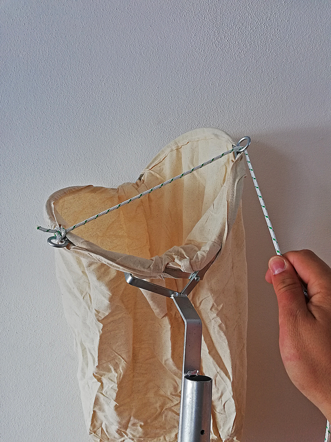 Filtrador de areia em tecido bege numa estrutura metálica com cordas