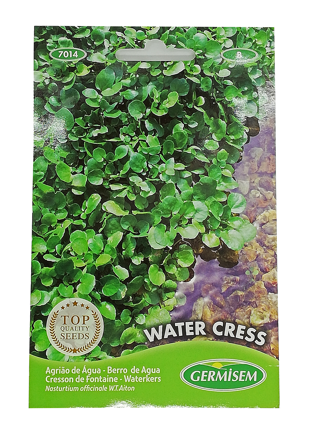 Pacote de sementes Agrião de Água Germisem com folhas verdes e texto multilingue