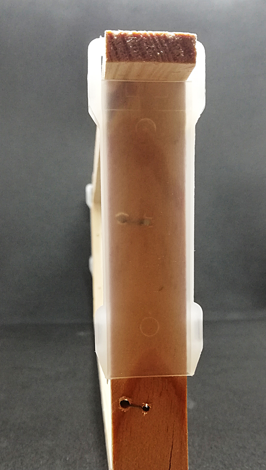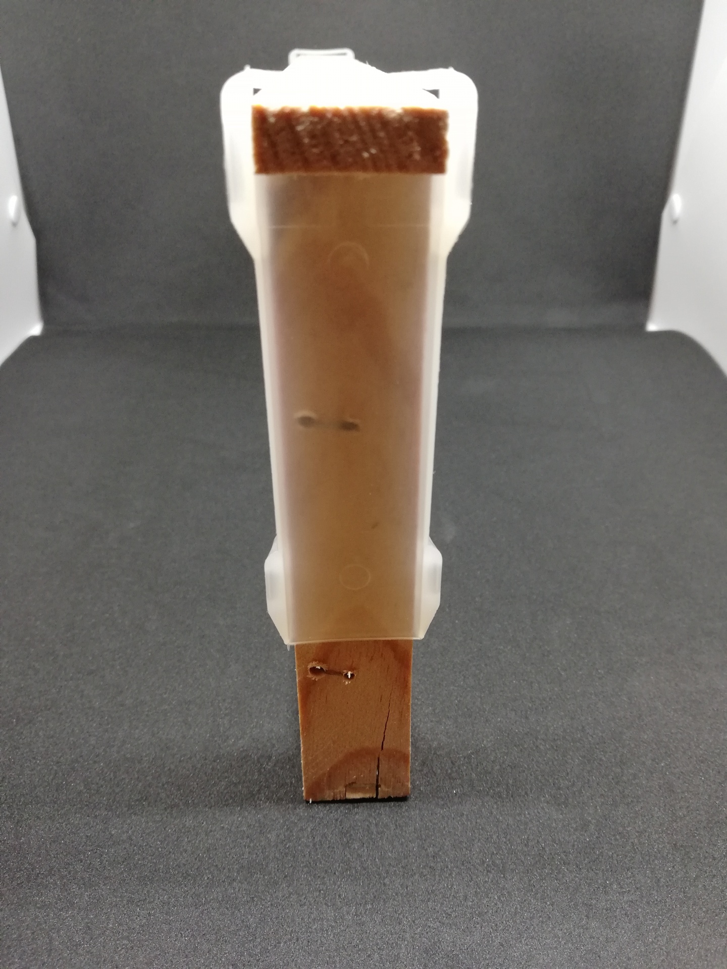 Peça de madeira com capa plástica translúcida em fundo cinza