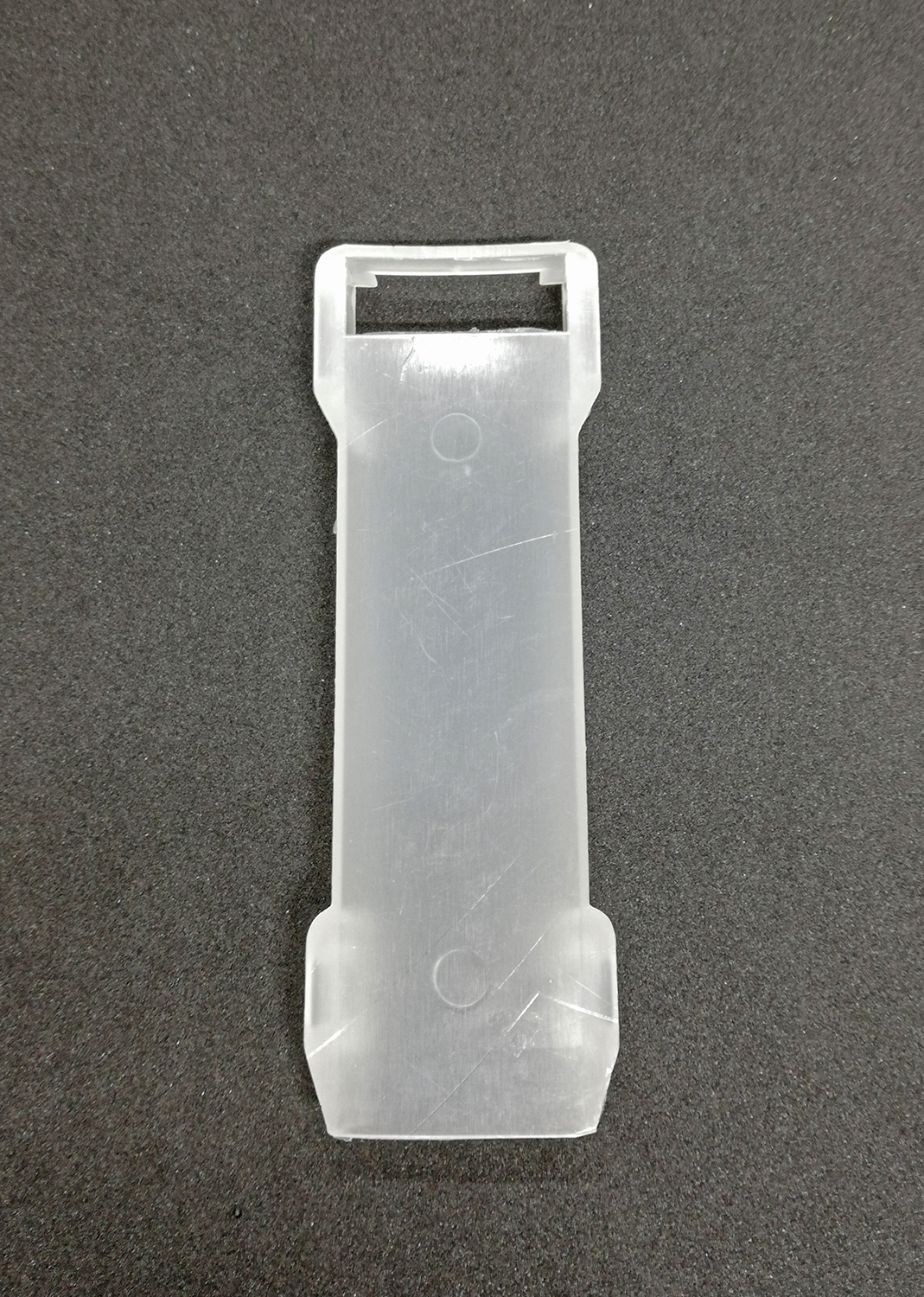 Peça plástica transparente retangular com abertura numa ponta sobre fundo preto