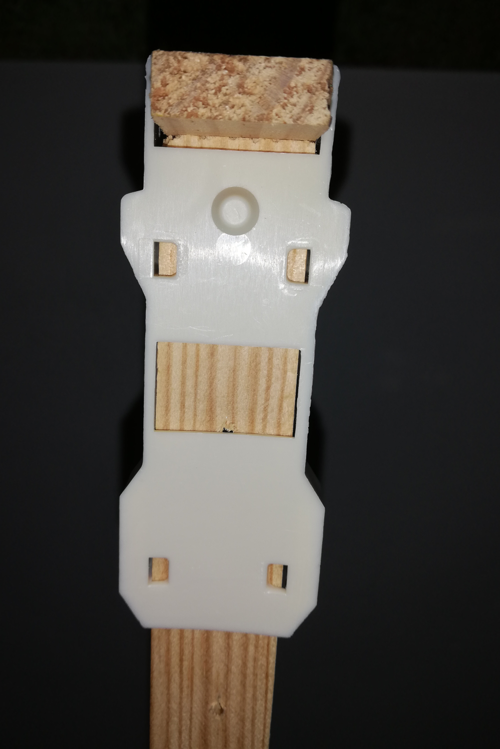 Peça de madeira clara com placa branca de plástico e encaixes