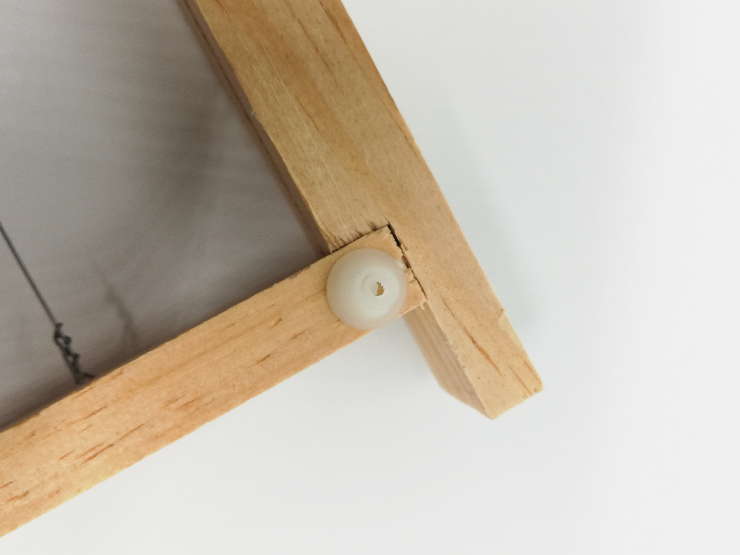 Peça de madeira clara com pino plástico branco em fundo branco