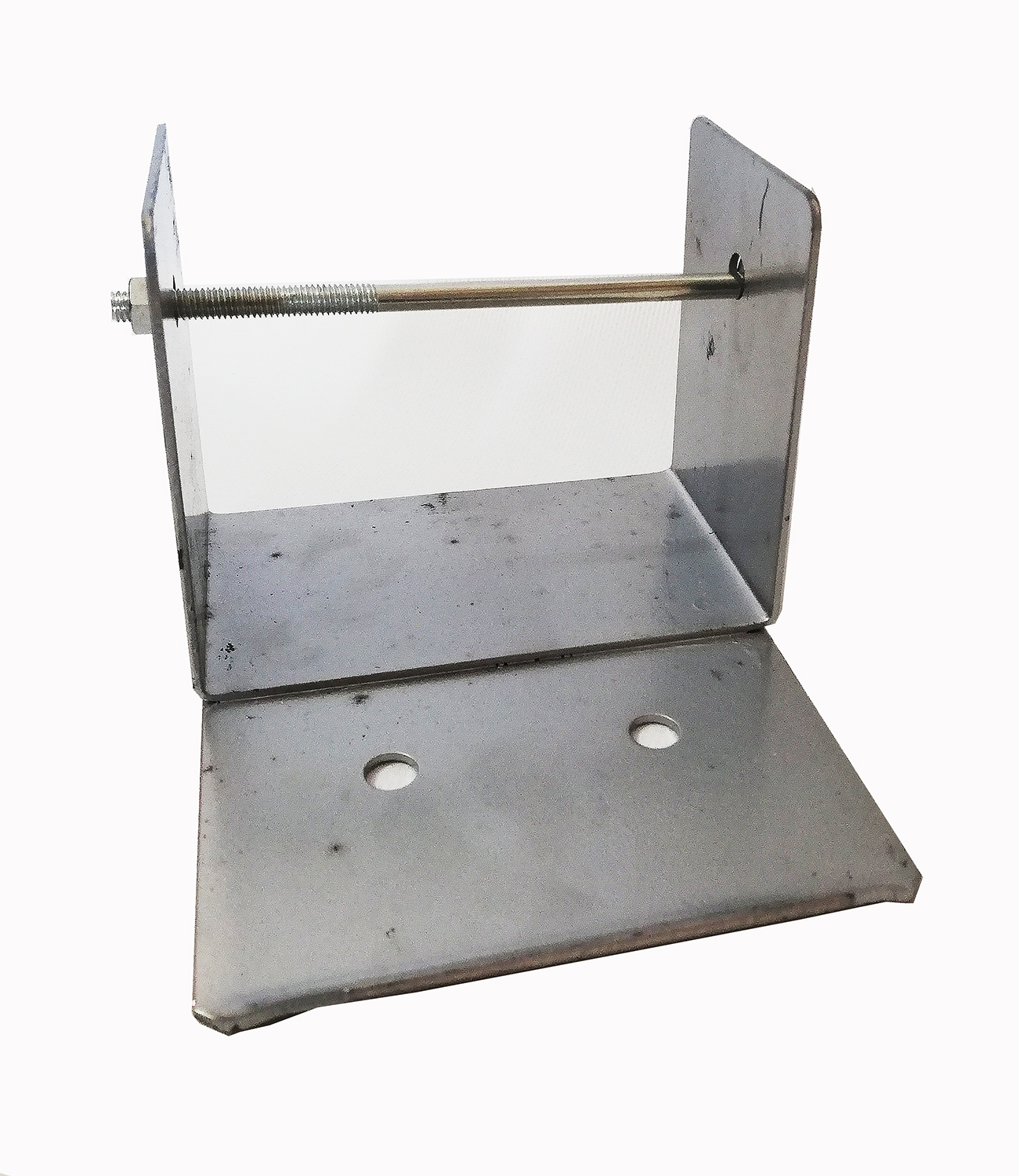 Estrutura metálica cinzenta com parafuso e porca, orifícios circulares