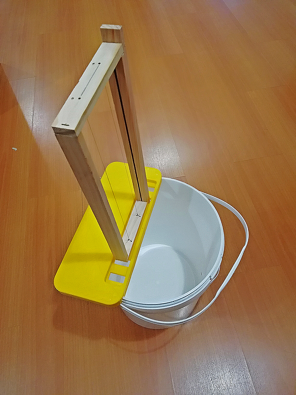 Espelho de madeira com base amarela sobre balde branco em chão castanho-laranja