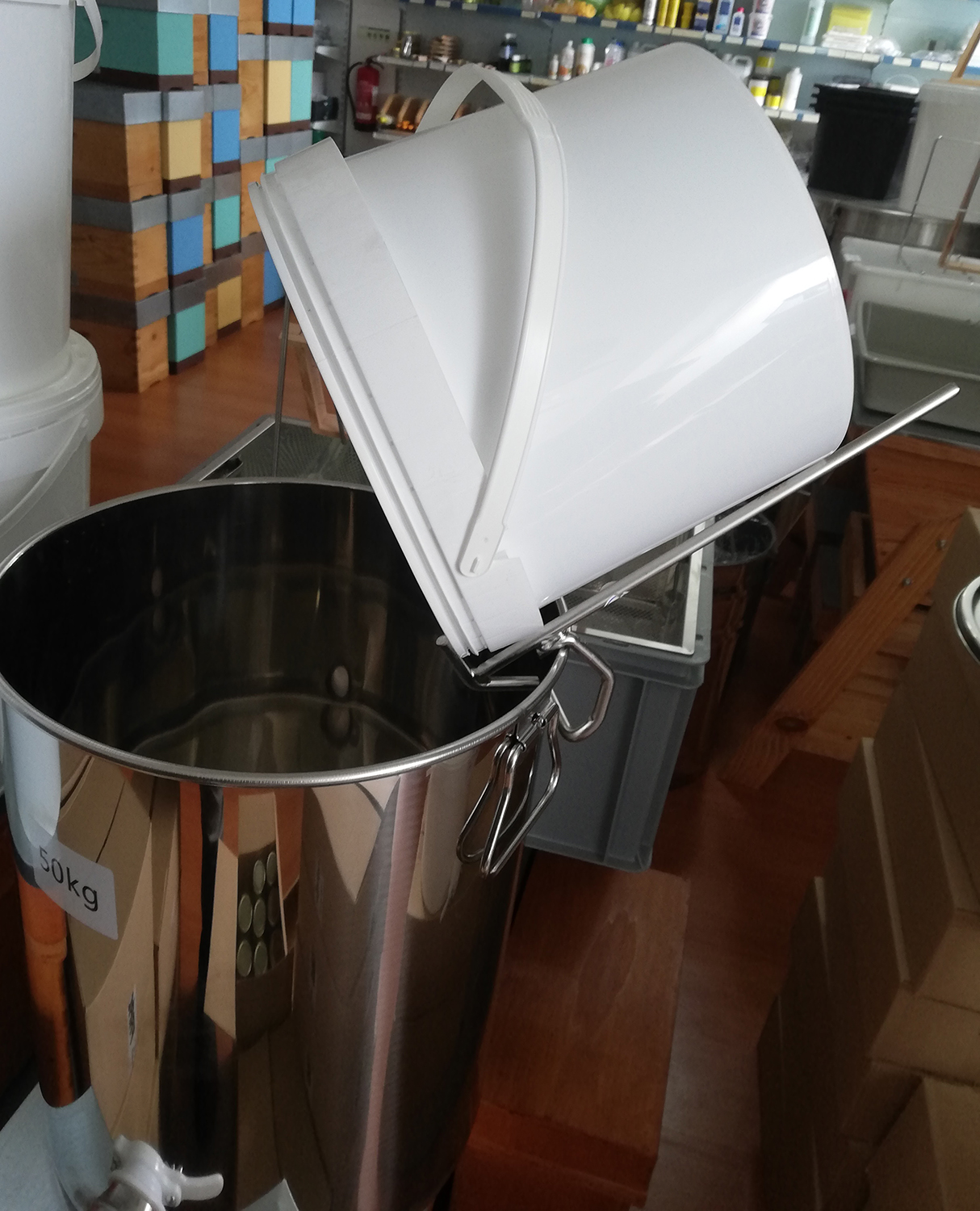 Balde branco inclinado sobre recipiente de aço inoxidável