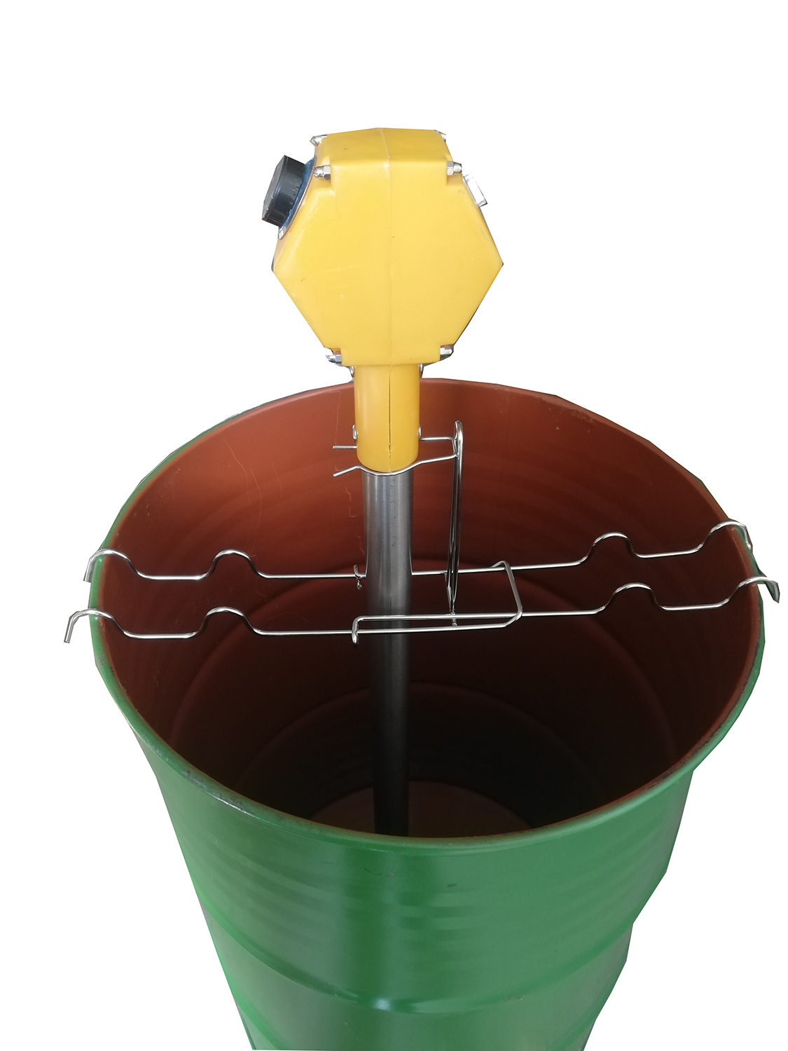 Bidão verde com equipamento metálico amarelo e estrutura interna