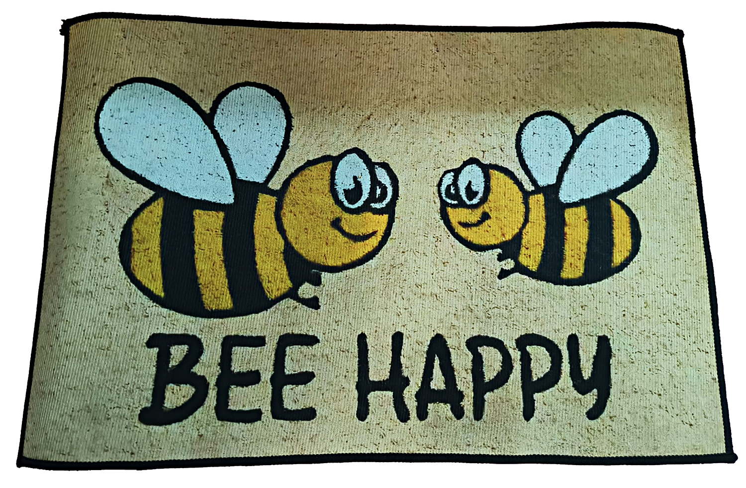 Tapete com desenho de abelhas e texto BEE HAPPY
