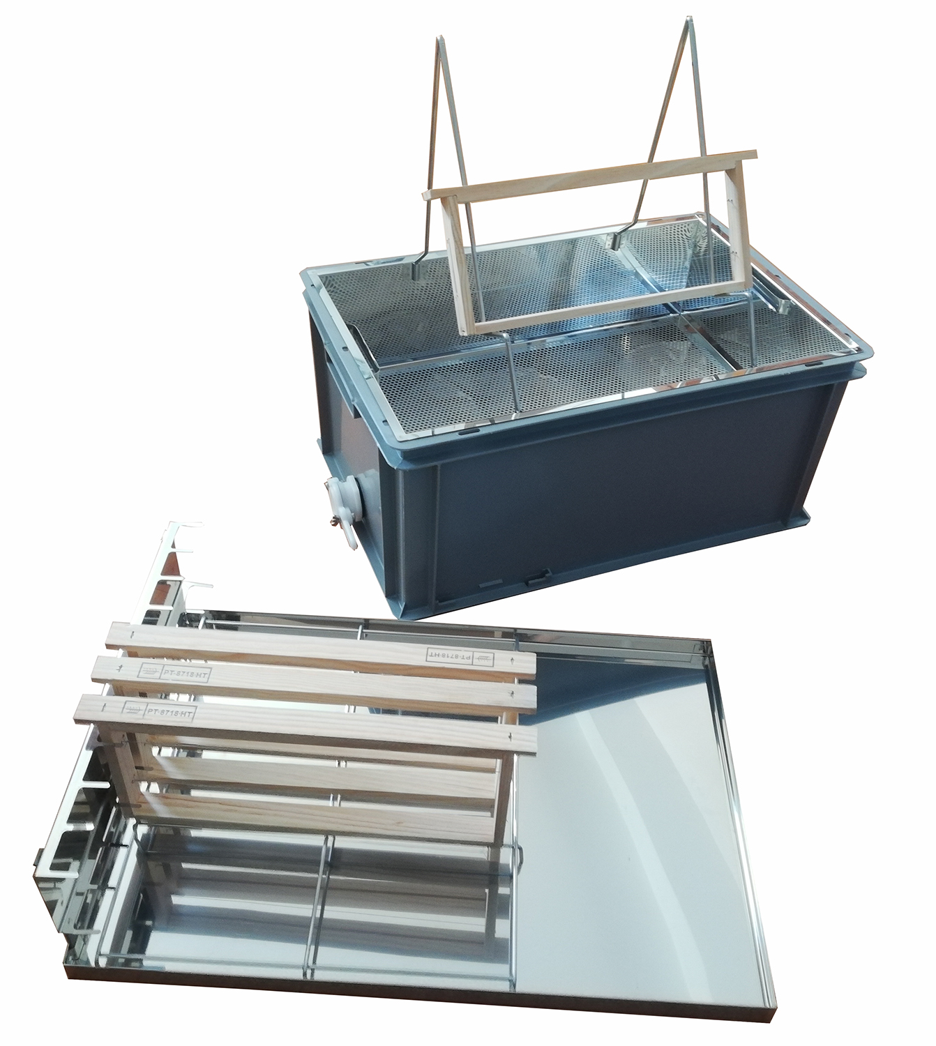 Caixa de apicultura azul com armações em madeira e bandeja metálica prateada