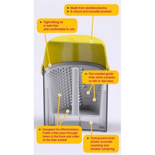 Ferramenta ideal e prática para efectuar a contagem de varroa, calculando assim o grau de infestação.