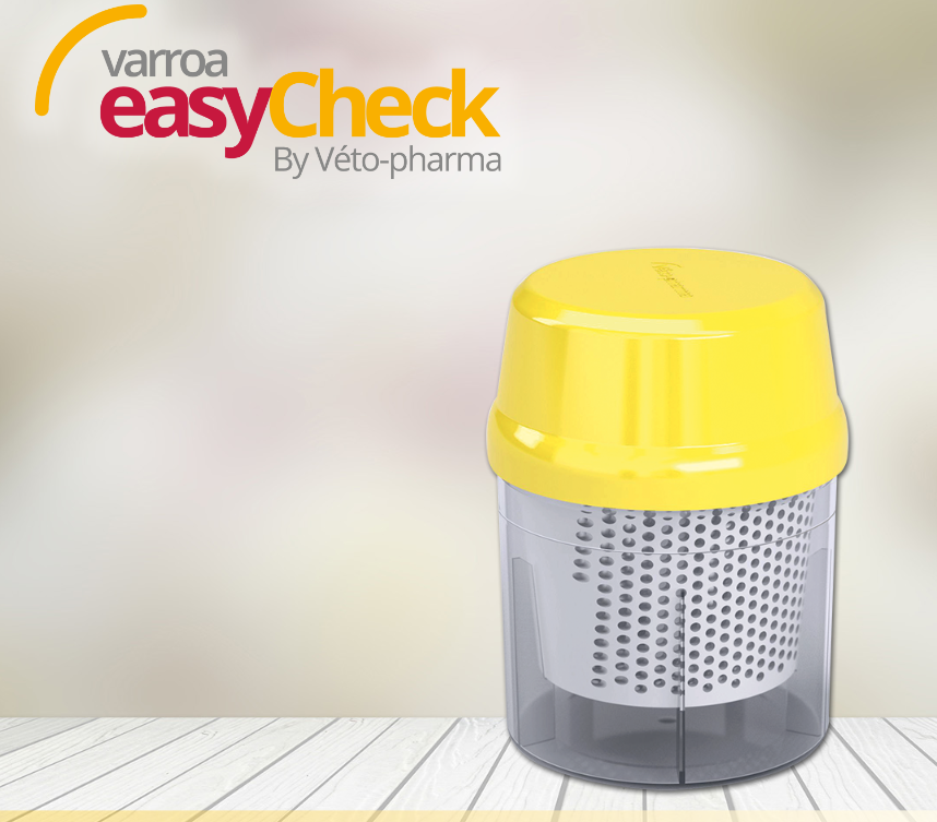 Recipiente plástico com tampa amarela e texto varroa easyCheck