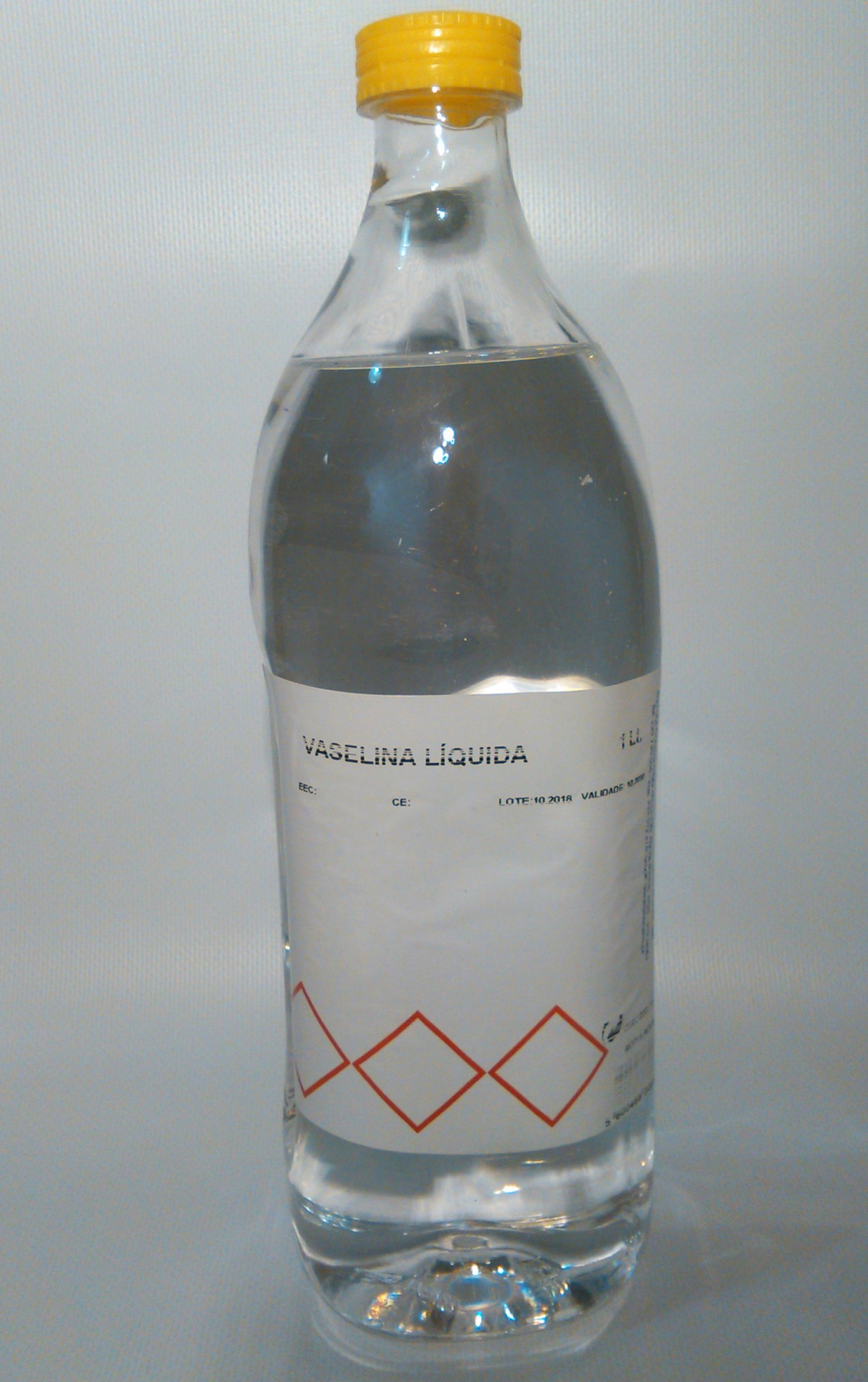 Garrafa plástica com líquido transparente e rótulo com texto 'VASELINA LÍQUIDA'.