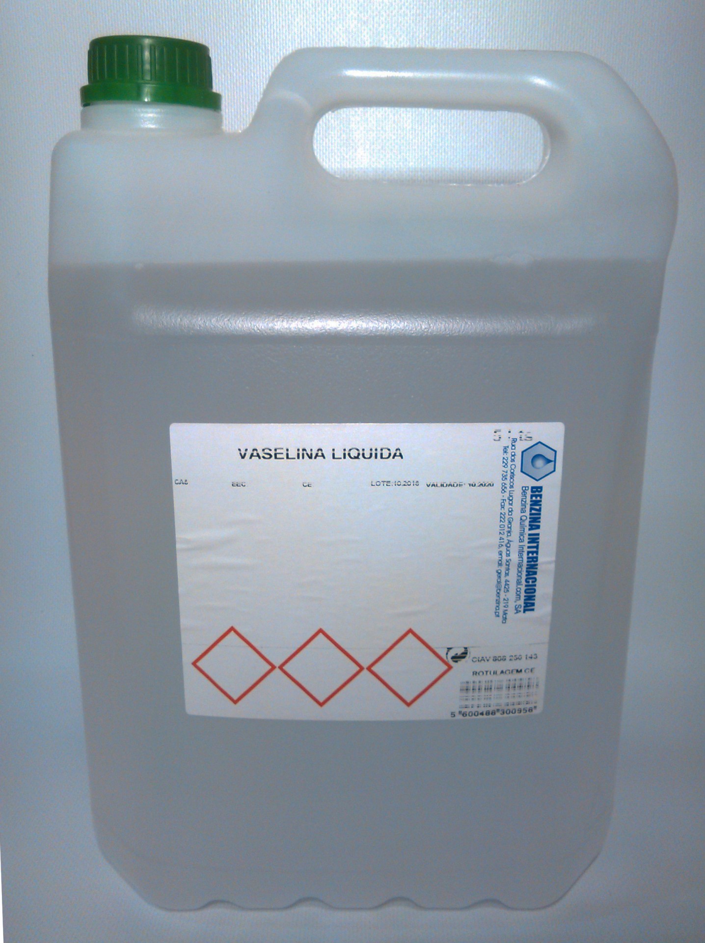 Recipiente plástico com vaselina líquida e etiqueta com texto e símbolos de risco