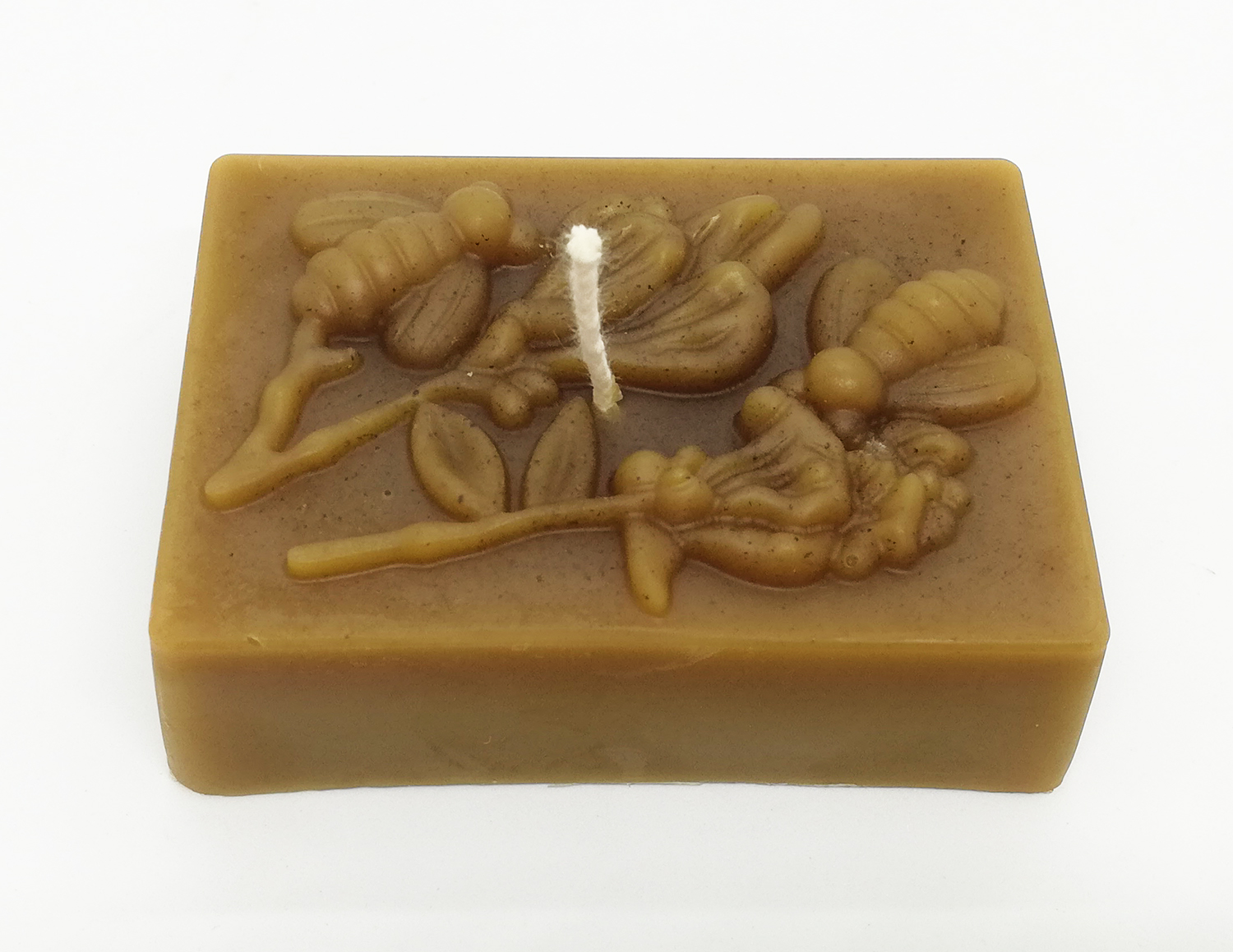 Sabonete retangular castanho com relevo de abelhas e flores e corda branca.