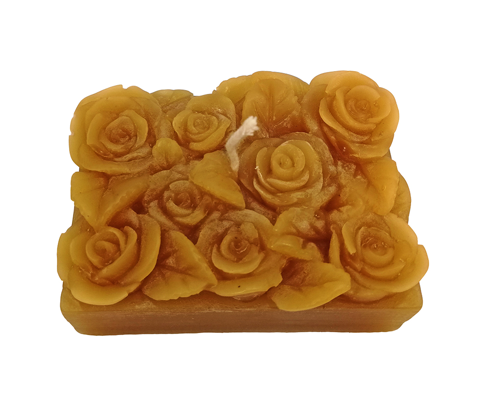 Vela amarela decorativa com rosas esculturais na superfície