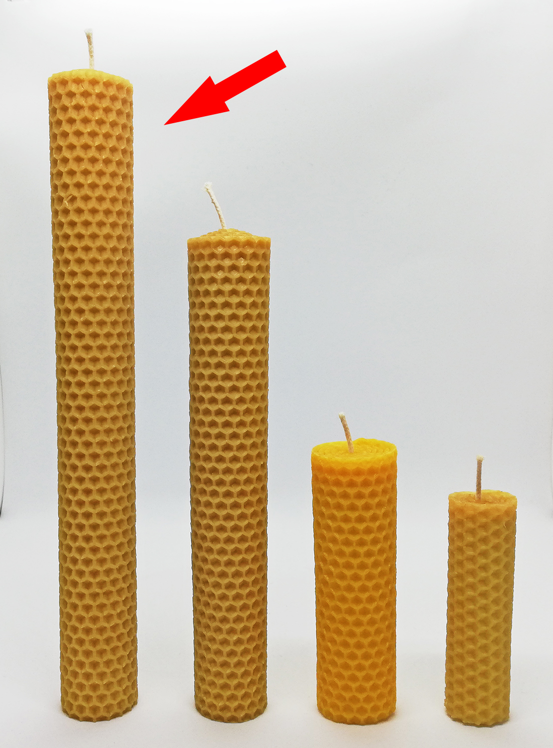 Quatro velas de cera com padrão de colmeia em alturas diferentes