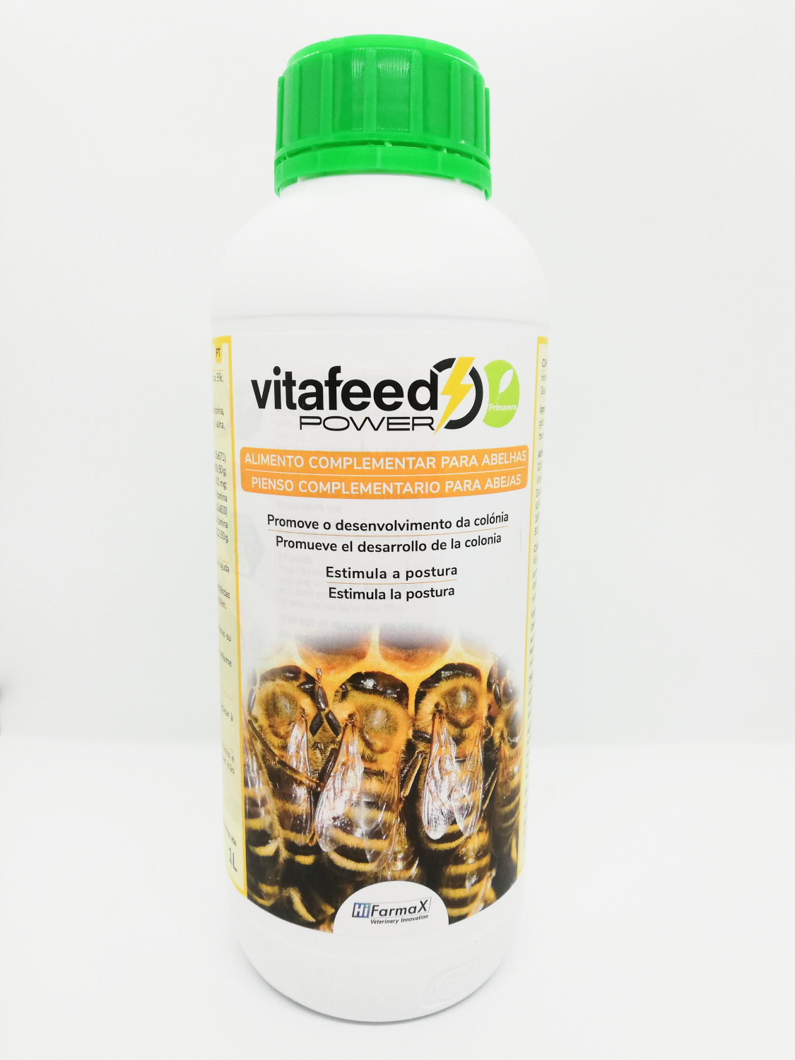 Frasco de alimento complementar para abelhas Vitafeed Power com rótulo e tampa verde